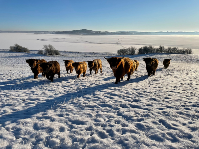 I sommerhalvåret bliver der igen lavet wrapgræs på bakkerne til supplement til vinterfodring, og sådan kører årshjulet rundt. Dyrene er aldrig inde, men har rig mulighed for, at gå i læ i de mange skovklatter, der er på arealerne. Eneste supplement af foder, de får, er brød vi har med, når vi tilser dyrene, kun for at undgå, at de ikke bliver vilde. Markerne får ikke tildelt nogen form for næringsstoffer ol. Kødet smager af lokal natur, fjordudsigt og et godt liv. Hver gang vi spiser et kg. kød af disse dyr, undgår vi, at mange næringsstoffer havne i Hjarbæk Fjord. Jeg ville gerne kunne oplyse, hvor meget kvælstof der ikke kommer i fjorden, med denne form for naturpleje. Det kan jeg ikke, men fornemmelsen er rigtig god.
